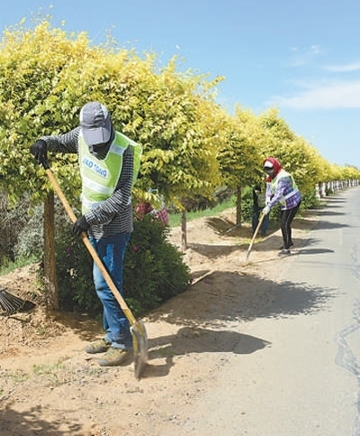 磴口縣防沙治沙局森林管護(hù)大隊(duì)工作人員在為堤防公路兩側(cè)的林帶除草。張 棖 邢 皓攝影報(bào)道