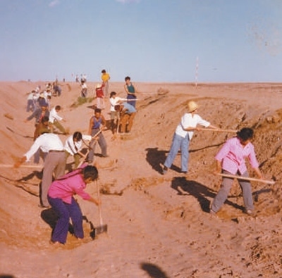 上世紀(jì)80年代,磴口縣干部群眾在挖掘灌溉渠。中國林科院沙漠林業(yè)實(shí)驗(yàn)中心供圖