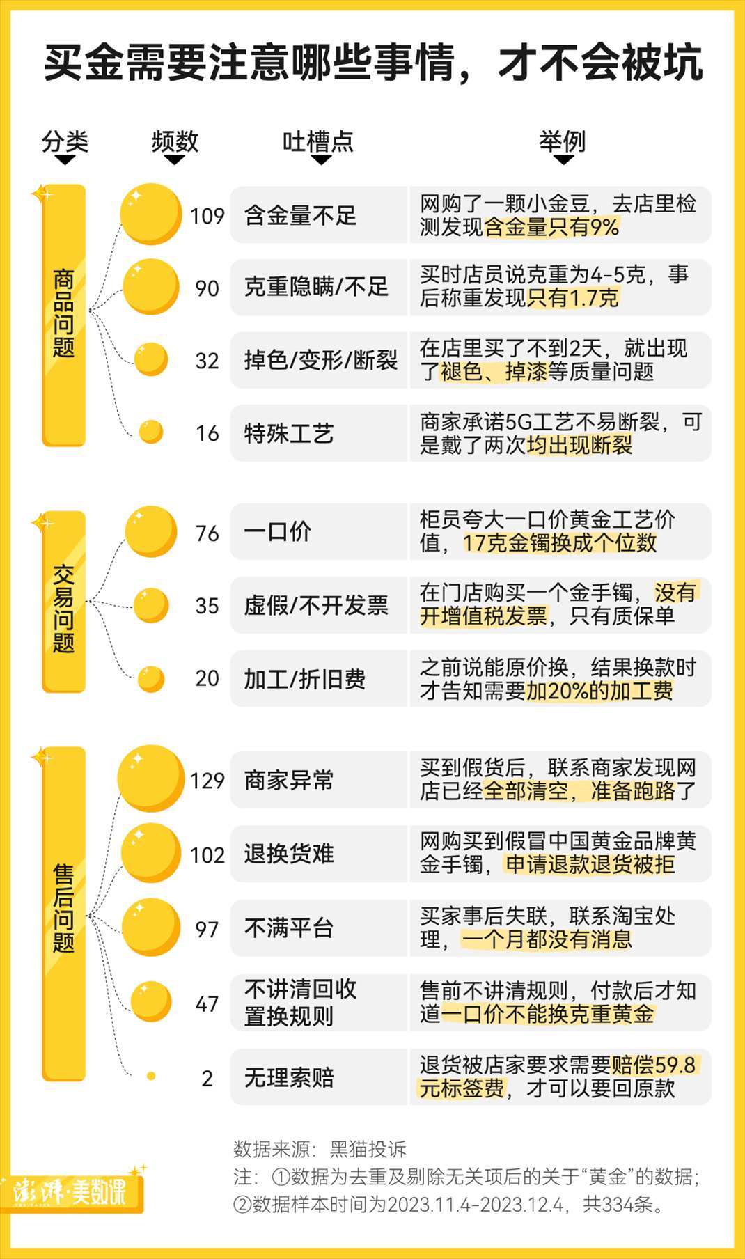 為了梳理出購買黃金中可能遇到的問題,澎湃新聞收集了2023年近一年來在黑貓投訴上的6000余條關(guān)于“黃金”的投訴數(shù)據(jù),發(fā)現(xiàn)含金量不足、克重不足等等,都是大家買金時較常遇到的商品問題。