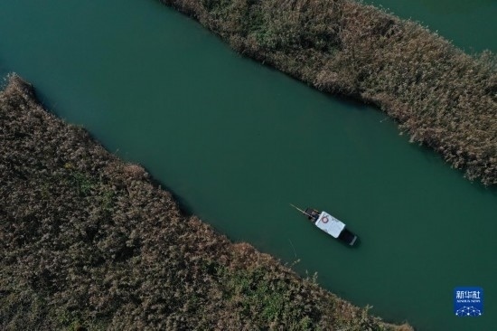 12月14日,游客乘坐搖櫓船在西溪濕地欣賞蘆花(無(wú)人機(jī)照片)。