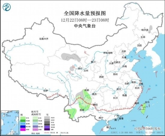圖4 全國降水量預(yù)報圖(12月22日08時-23日08時)