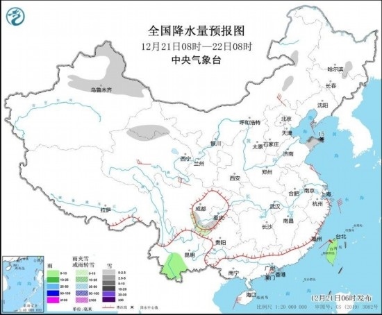 圖3 全國降水量預(yù)報圖(12月21日08時-22日08時)