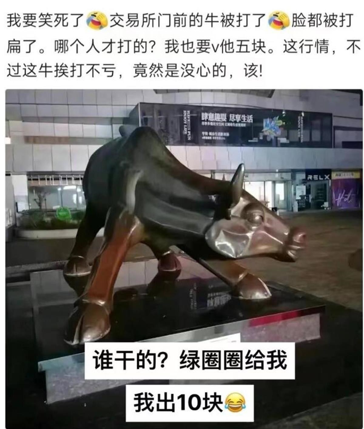 帖文中寫道:交易所的牛被砸了?請別這么極端,冤有頭債有主,牛何其無辜。牛被打臉、??招氖切苁泻笃谔卣?。