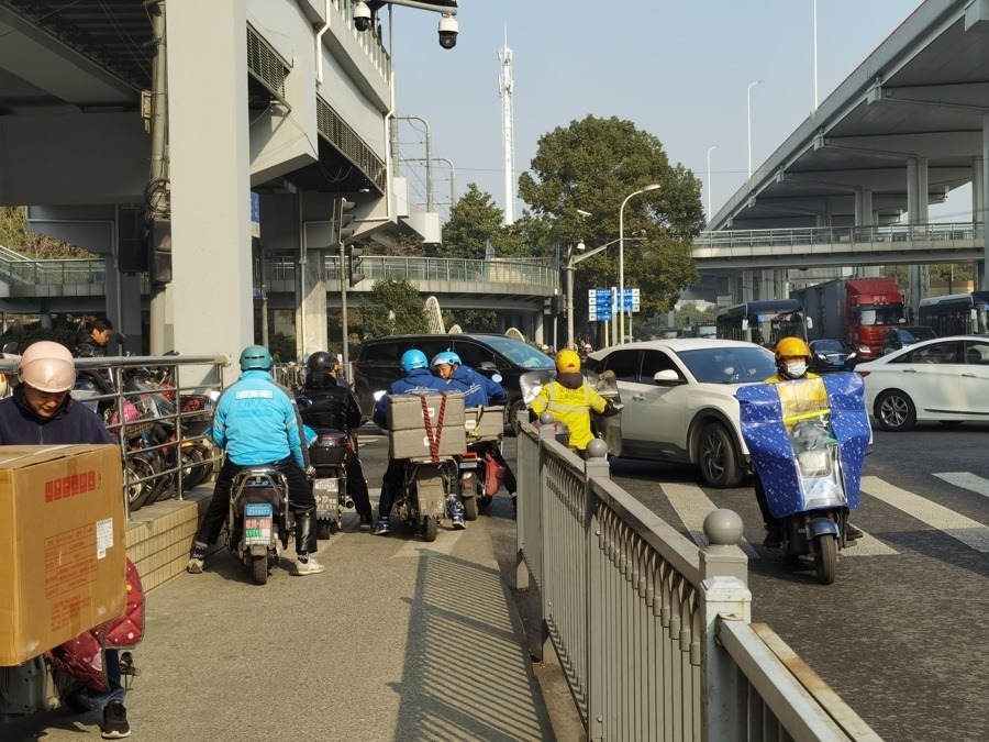這也不是僅限青浦區(qū)。調查發(fā)現(xiàn),一些區(qū)域騎手逆行現(xiàn)象集中,背后都有平臺的“功勞”。在“12345”,有市民投訴逸仙路上騎手逆行現(xiàn)象突出,尤其是在安汾路殷高西路等路口。1月9日近中午時分,記者又來到該路段。逸仙路西側近殷高西路路口處,是名為“寶山新業(yè)坊”的商圈,外賣業(yè)務集中。記者觀察發(fā)現(xiàn),大量騎手取餐后若要向北送餐,無一例外都是直接沿逸仙路西側逆行向北,沒有騎手會向南五六百米到安汾路繞行過街后再向北。以至于逸仙路殷高西路路口南北向紅燈時,等燈的逆行騎手能排成一排。