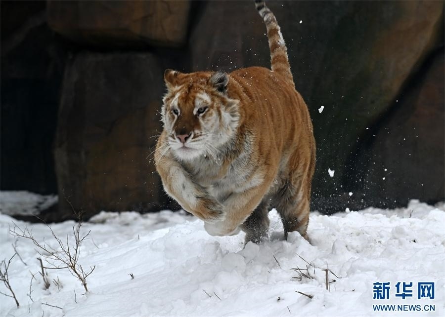 河南省沁陽市和生森林動(dòng)物樂園大型貓科動(dòng)物散養(yǎng)區(qū),一只孟加拉金虎在雪地上奔跑。