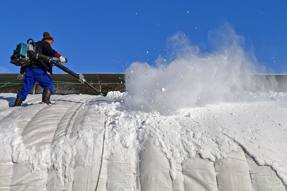 2023年12月17日,農(nóng)民在山東省煙臺市福山區(qū)門樓街道用鼓風(fēng)機清理暖棚上的積雪。新華社發(fā)(孫文潭攝)