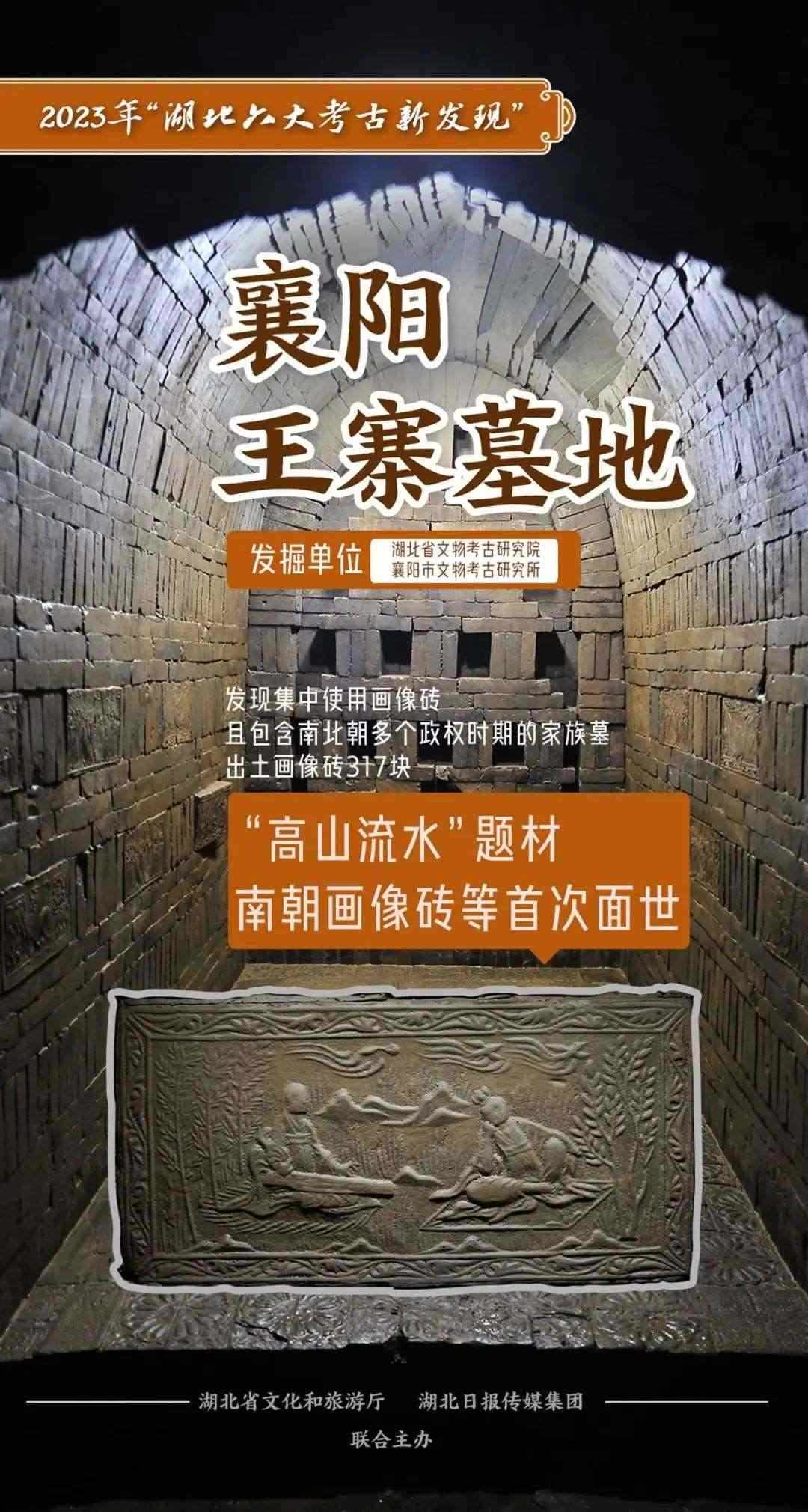 襄陽(yáng)王寨墓地,發(fā)現(xiàn)一處集中使用畫(huà)像磚且年代跨越南、北朝多個(gè)政權(quán)時(shí)期的家族墓,其中7座墓葬出土畫(huà)像磚共計(jì)317塊,涉及19種不同圖案。首次發(fā)現(xiàn)“高山流水”題材以及“五音直郎”“小輿大駕行”“牽誕馬”榜題的畫(huà)像磚。