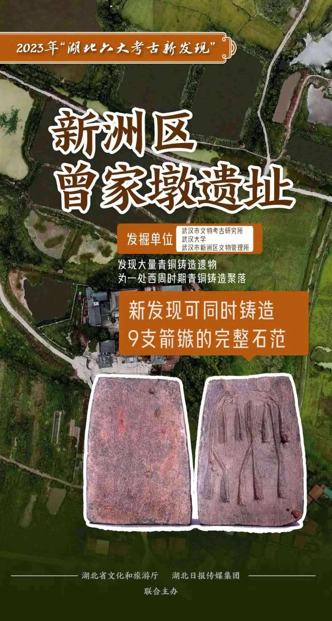 繼武漢黃陂盤(pán)龍城遺址小嘴遺址點(diǎn)、郭元咀遺址發(fā)現(xiàn)商代鑄銅遺存后,考古工作者在新洲曾家墩遺址新發(fā)現(xiàn)西周時(shí)期青銅鑄造遺存。遺址出土一塊用于鑄造青銅箭鏃的石范(即鑄造青銅器的石質(zhì)模具),保存完好,其完整程度在此前湖北地區(qū)考古中未曾發(fā)現(xiàn)。這塊石范可同時(shí)鑄造9支青銅箭鏃,具有相當(dāng)高的工藝水平。