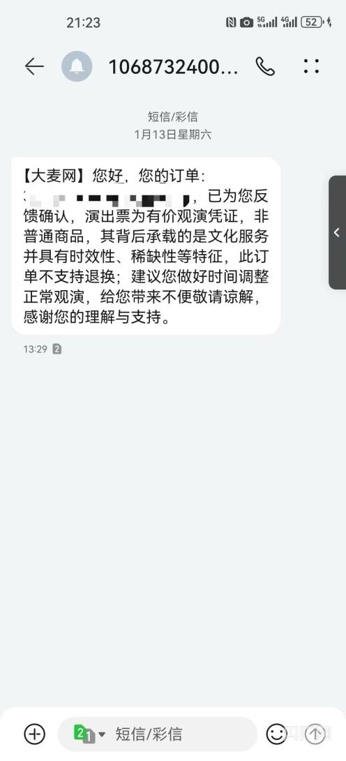 周女士說自己第一時間就通過多個渠道嘗試退票,但都沒有成功?!叭斯た头墓ぷ鲿r間是早上9點到晚上8點,我打電話的時候不在他們工作時間范圍內(nèi)。當(dāng)時也確實聯(lián)系不到其他渠道,于是我就在12315,包括黑貓投訴進行退票退款的申請。13號早上9點,大麥客服說此訂單不支持退換,13號下午1點半的時候,給了我一個反饋短信,說是已為我反饋確認,演出票為有價觀影憑證非普通商品,其背后承載的是文化服務(wù),并具有時效性、稀缺性等特征,此訂單不支持退換,然后就建議我做好時間調(diào)整正常觀演?!?/p>