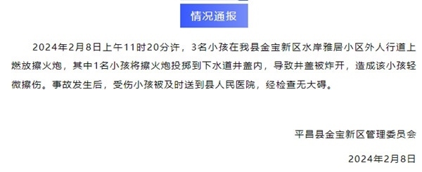 ·四川平昌通報(bào)“小孩放鞭炮炸飛多個(gè)井蓋”:1人輕微擦傷無(wú)大礙。