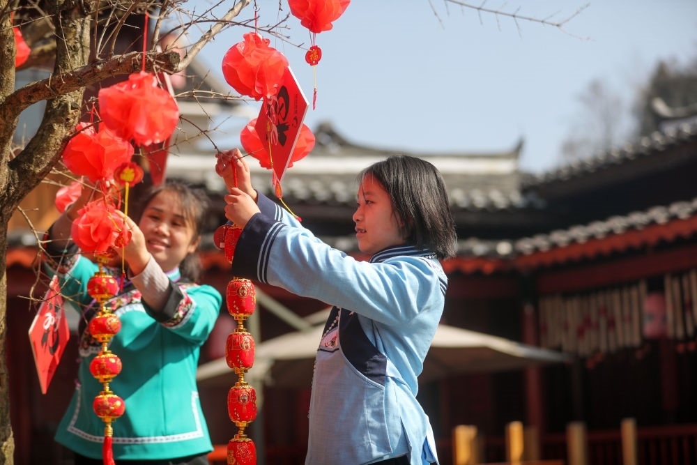 2月10日,在貴州省貴陽(yáng)市烏當(dāng)區(qū)偏坡布依族鄉(xiāng)偏坡村,出生于2012年的“龍寶寶”韋詩(shī)穎 (右)和家人一起在院子里掛新春飾品。新華社發(fā)(袁福洪 攝)