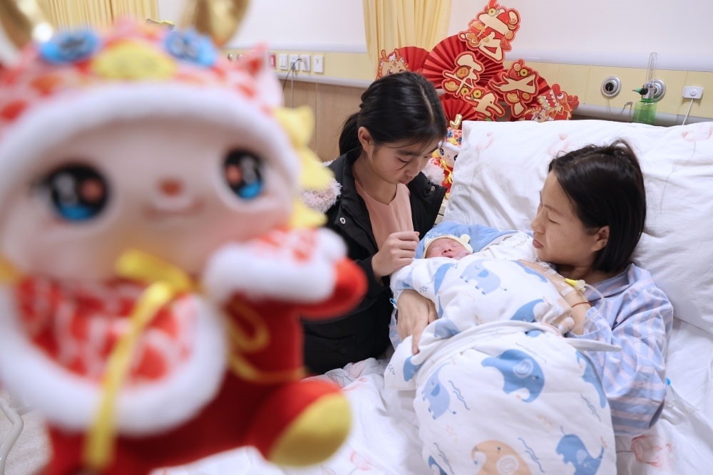 2月10日,在江蘇無(wú)錫怡和婦產(chǎn)醫(yī)院產(chǎn)科病區(qū)內(nèi),一名剛出生的“龍寶寶”和媽媽、姐姐在一起。新華社發(fā)(朱吉鵬 攝)