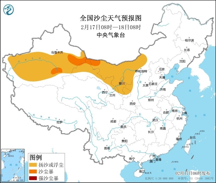 受冷空氣大風(fēng)影響,預(yù)計(jì)2月17日08時(shí)至18日08時(shí),新疆東部和南疆盆地、內(nèi)蒙古中西部、甘肅北部、寧夏大部、陜西西北部等地的部分地區(qū)有揚(yáng)沙或浮塵天氣,新疆東部和南疆盆地東南部、內(nèi)蒙古西部、甘肅北部等局地有沙塵暴。