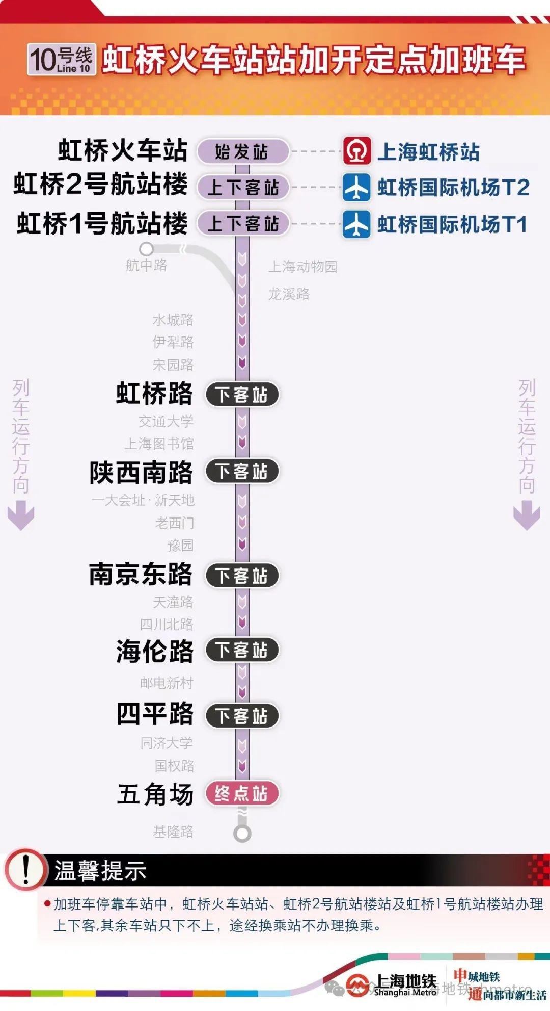 今日,10號線虹橋火車站加班車延長至2月18日2:30。其中,10號線虹橋火車站站往五角場站方向定點加班車沿途僅??亢鐦蚧疖囌菊?、虹橋2號航站樓站、虹橋1號航站樓站、虹橋路站、陜西南路站、南京東路站、海倫路站、四平路站、五角場站,其余車站跳停。??寇囌局?,虹橋火車站站、虹橋2號航站樓站、虹橋1號航站樓站可同時上下客,其余車站只下不上,途經(jīng)換乘站不可換乘。