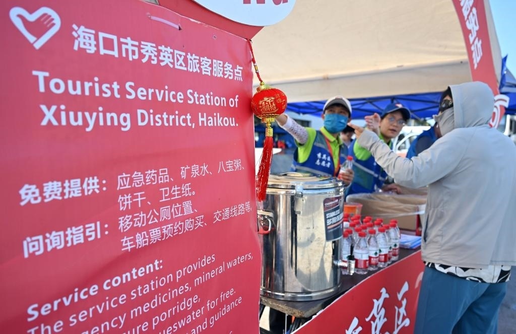 記者在新海港附近一處旅客服務(wù)點(diǎn)看到,幾位志愿者在向旅客發(fā)放免費(fèi)礦泉水和餅干。