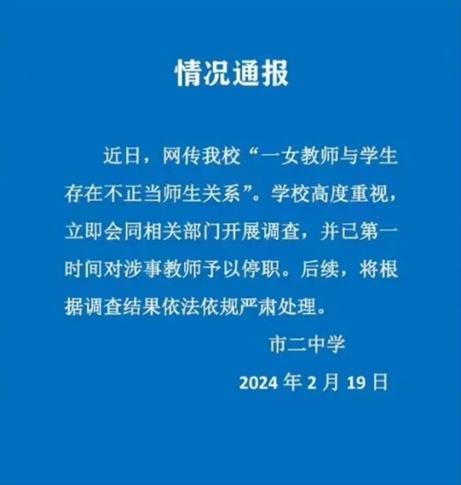 ·上海一高中女教師被舉報出軌16歲學生,校方通報:涉事教師停職。