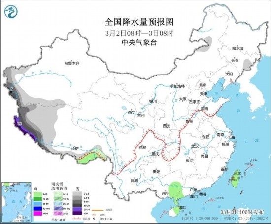 3月2日08時至3日08時,新疆南疆西部山區(qū)、西藏西部和南部等地部分地區(qū)有中到大雪,其中,新疆南疆盆地西部、西藏南部和西部等地部分地區(qū)有暴雪,西藏南部和西部部分地區(qū)有大暴雪,局地特大暴雪(30~50毫米)。廣西東南部、廣東西南部、海南島東北部、臺灣島等地部分地區(qū)有小雨。黃海大部海域、東海大部海域、臺灣海峽、南海大部海域、北部灣將有6~7級、陣風(fēng)8級的風(fēng)。