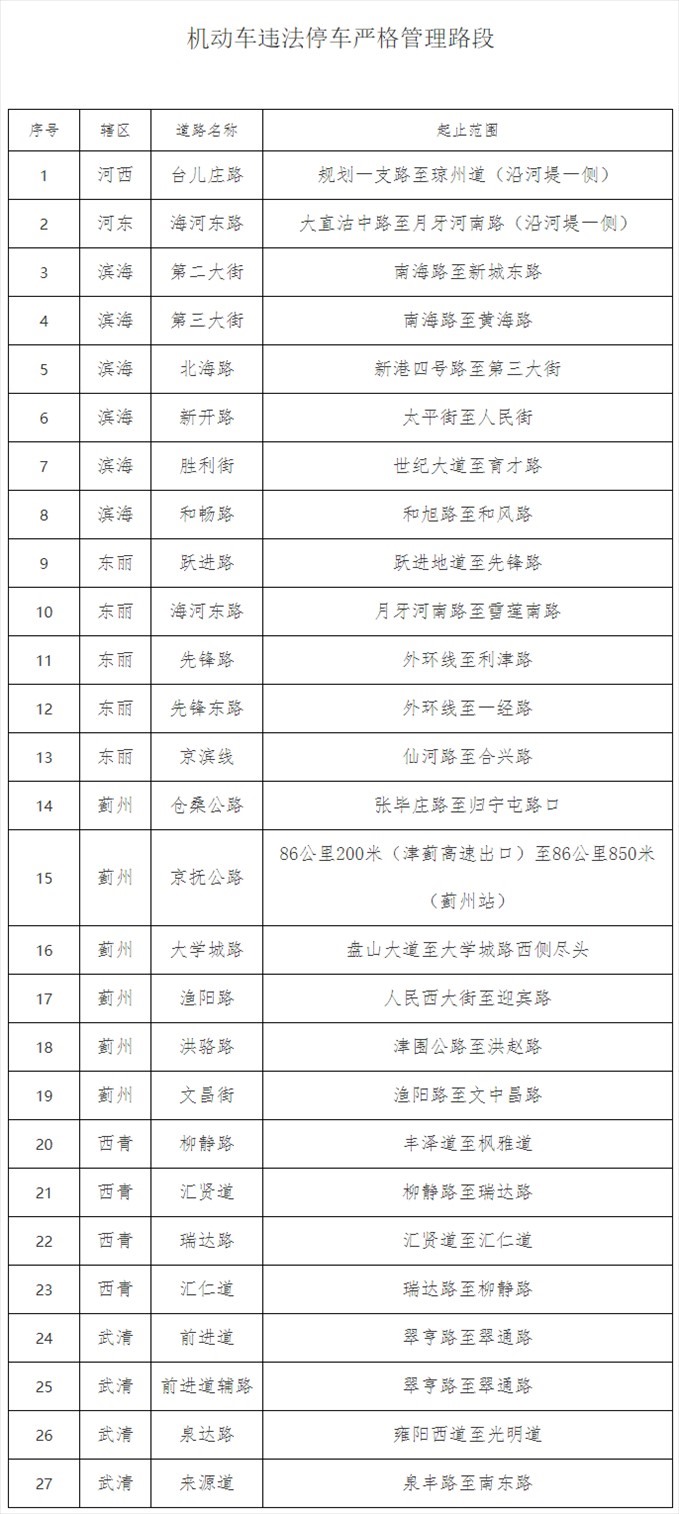 為進(jìn)一步加強(qiáng)天津市道路交通安全管理,規(guī)范靜態(tài)交通秩序,提高道路通行能力,根據(jù)《中華人民共和國道路交通安全法》及其實(shí)施條例等有關(guān)法律法規(guī)規(guī)定,天津市公安交通管理局根據(jù)道路通行實(shí)際情況,決定自2024年3月18日起,將下列27條路段設(shè)置為機(jī)動(dòng)車違法停車嚴(yán)格管理路段。機(jī)動(dòng)車在嚴(yán)格管理路段內(nèi)違法停放的,公安交管部門將在提醒糾正的同時(shí)依法予以處罰。