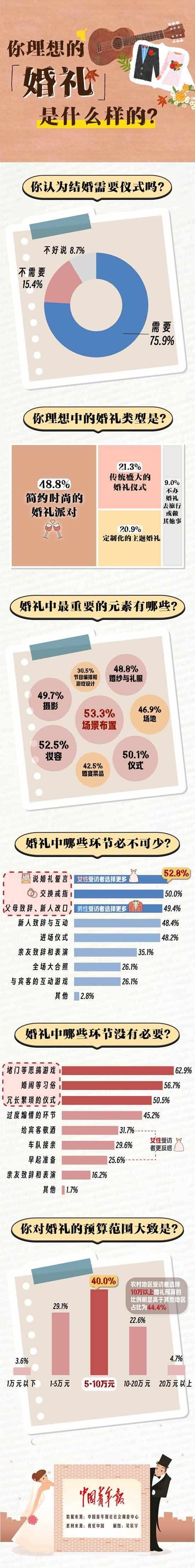 數(shù)據(jù)顯示,在婚禮中,受訪青年覺得最沒有必要的內(nèi)容依次是:堵門等惡搞游戲(62.9%)、婚鬧等習(xí)俗(56.7%)、冗長繁瑣的儀式(50.5%)。其他還有:過度煽情的環(huán)節(jié)(45.2%),給賓客敬酒(31.7%),車隊接親(29.6%),早起準(zhǔn)備(25.6%)等。