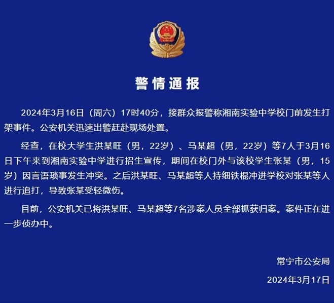 ·多人持棍沖進學校追打中學生,湖南常寧警方通報:7名涉案人員已全部抓獲歸案。