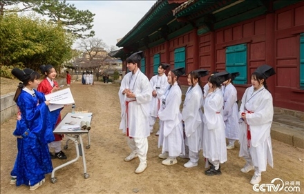 當?shù)貢r間2024年3月16日,韓國首爾,成均館大學的新生們穿著儒生服,參加一年一度的迎新禮。
