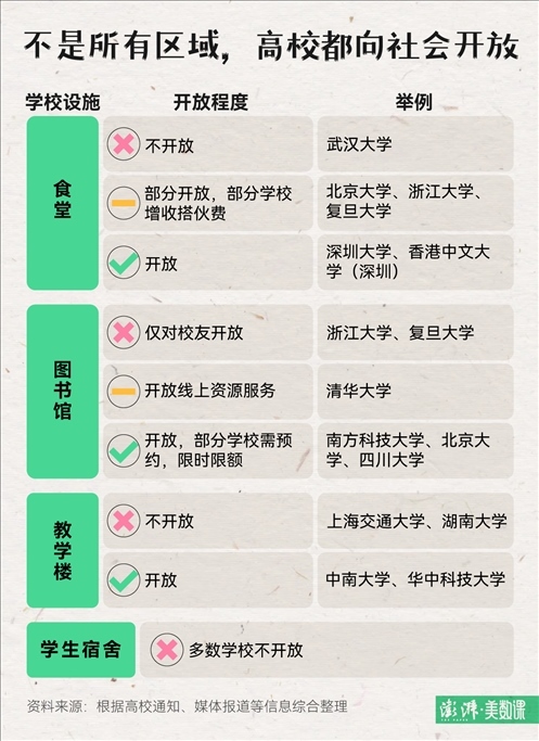 最令在校學(xué)生頭疼的要與游客爭(zhēng)搶學(xué)校資源的問題,例如食堂、圖書館和教學(xué)樓等,各個(gè)學(xué)校在決定開放校園的同時(shí)也給出了相關(guān)規(guī)定。