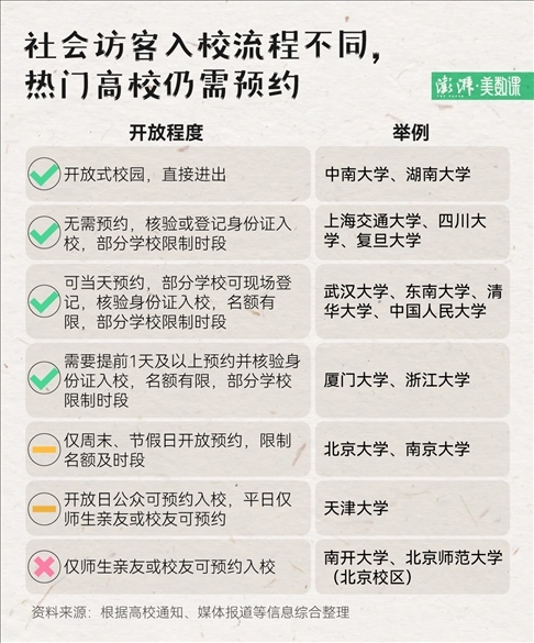 還有學(xué)校在訪客人數(shù)、開放時(shí)間上,做出了限制:清華大學(xué)工作日開放 2000 個(gè)名額,周末、節(jié)假日增加至 1.2 萬個(gè);北大、南大等學(xué)校工作日不開放,學(xué)期內(nèi)僅周末和法定節(jié)假日開放。