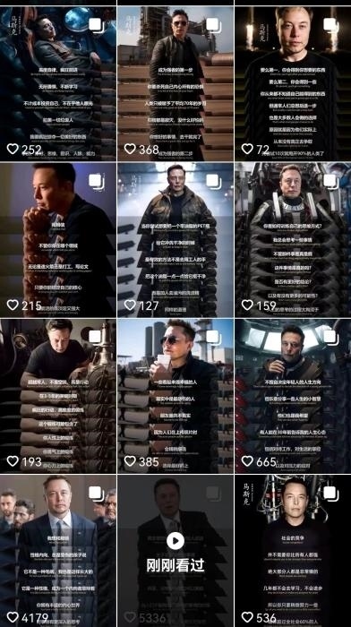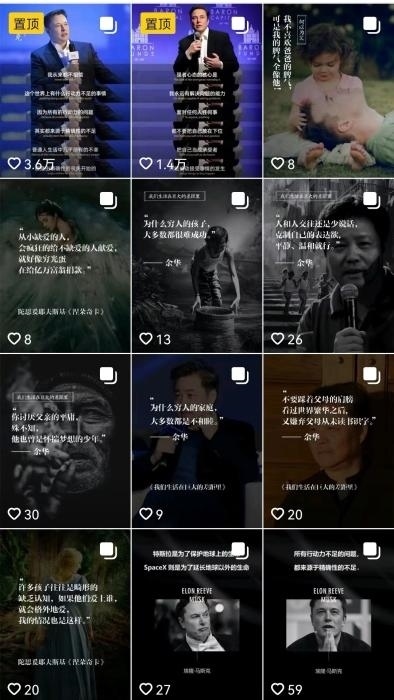 “滿屏皆是馬斯克”之外,在一些雞湯類賬號里,作家余華、知名投資人沃倫·巴菲特等也是“高產(chǎn)”創(chuàng)作者。