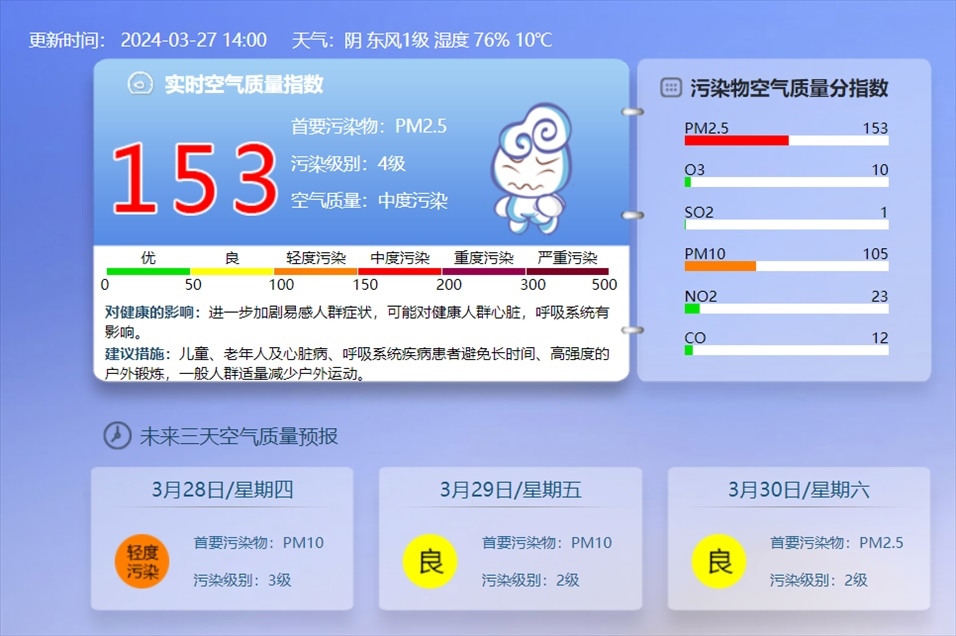 央視網(wǎng)消息:據(jù)@北京環(huán)境監(jiān)測 消息,3月27日14時,北京實時空氣質(zhì)量為中度污染,首要污染物為PM2.5,污染級別4級。