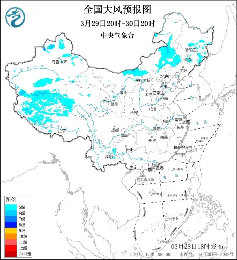 預(yù)計,3月28日20時至29日20時,內(nèi)蒙古大部、吉林西部、遼寧南部、甘肅東部、寧夏北部等地有5~6級、陣風(fēng)7~9級風(fēng);黃海中部和南部海域、東海東北部海域?qū)⒂?~8級、陣風(fēng)9級風(fēng),其中東海東北部的部分海域風(fēng)力可達9級、陣風(fēng)10級。