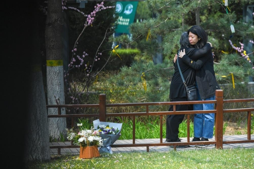 4月2日,在北京長青生命紀念園自然葬區(qū),自然葬逝者家屬在安放花束、祭奠親人后相擁。新華社記者 鞠煥宗 攝