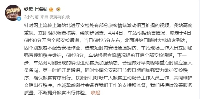 央視網(wǎng)消息:據(jù)@鐵路上海站 消息,針對(duì)網(wǎng)上流傳上海站北進(jìn)廳安檢處有部分旅客情緒激動(dòng)相互推搡的視頻,車站高度重視,立即組織調(diào)查核實(shí)。經(jīng)初步調(diào)查,4月4日,車站根據(jù)預(yù)售情況,原定于4日6時(shí)30分開啟全部安檢通道,當(dāng)日6時(shí)25分左右,北面進(jìn)站口瞬時(shí)大批旅客到達(dá),因個(gè)別旅客不配合安檢作業(yè),造成短時(shí)內(nèi)安檢通道擁擠,車站現(xiàn)場(chǎng)工作人員立即加強(qiáng)宣傳和秩序維護(hù)。6時(shí)28分,車站根據(jù)客流情況提前開啟全部安檢通道。下一步,車站對(duì)可能出現(xiàn)的瞬時(shí)進(jìn)站客流加強(qiáng)預(yù)想,合理做好早高峰等重點(diǎn)時(shí)段應(yīng)急人員備崗,第一時(shí)間開足通道。同時(shí)協(xié)調(diào)公安部門節(jié)假日期間加強(qiáng)警力維護(hù)安檢秩序,確保旅客有序出行。鐵路部門呼吁廣大旅客主動(dòng)配合工作人員工作,共同維護(hù)文明出行秩序,也誠(chéng)摯感謝社會(huì)各界對(duì)其工作的支持和監(jiān)督,將持續(xù)改善服務(wù)質(zhì)量,不斷提升旅客出行體驗(yàn)。