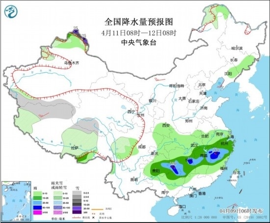 4月11日08時(shí)至12日08時(shí),新疆北疆北部、內(nèi)蒙古東北部、黑龍江西北部、西藏西部和中北部、青海南部、川西高原等地部分地區(qū)有小到中雪或雨夾雪,其中,新疆北疆北部高海拔地區(qū)有大到暴雪,局地大暴雪(20~25毫米)。貴州東部、廣西北部、江南大部的部分地區(qū)有中到大雨,其中,湖南東部和西南部、廣西北部、江西東北部、浙江西南部、福建西北部等地部分地區(qū)有暴雨或大暴雨(100~120毫米)。內(nèi)蒙古西北部、西藏西部等地部分地區(qū)有4~5級(jí)風(fēng)。