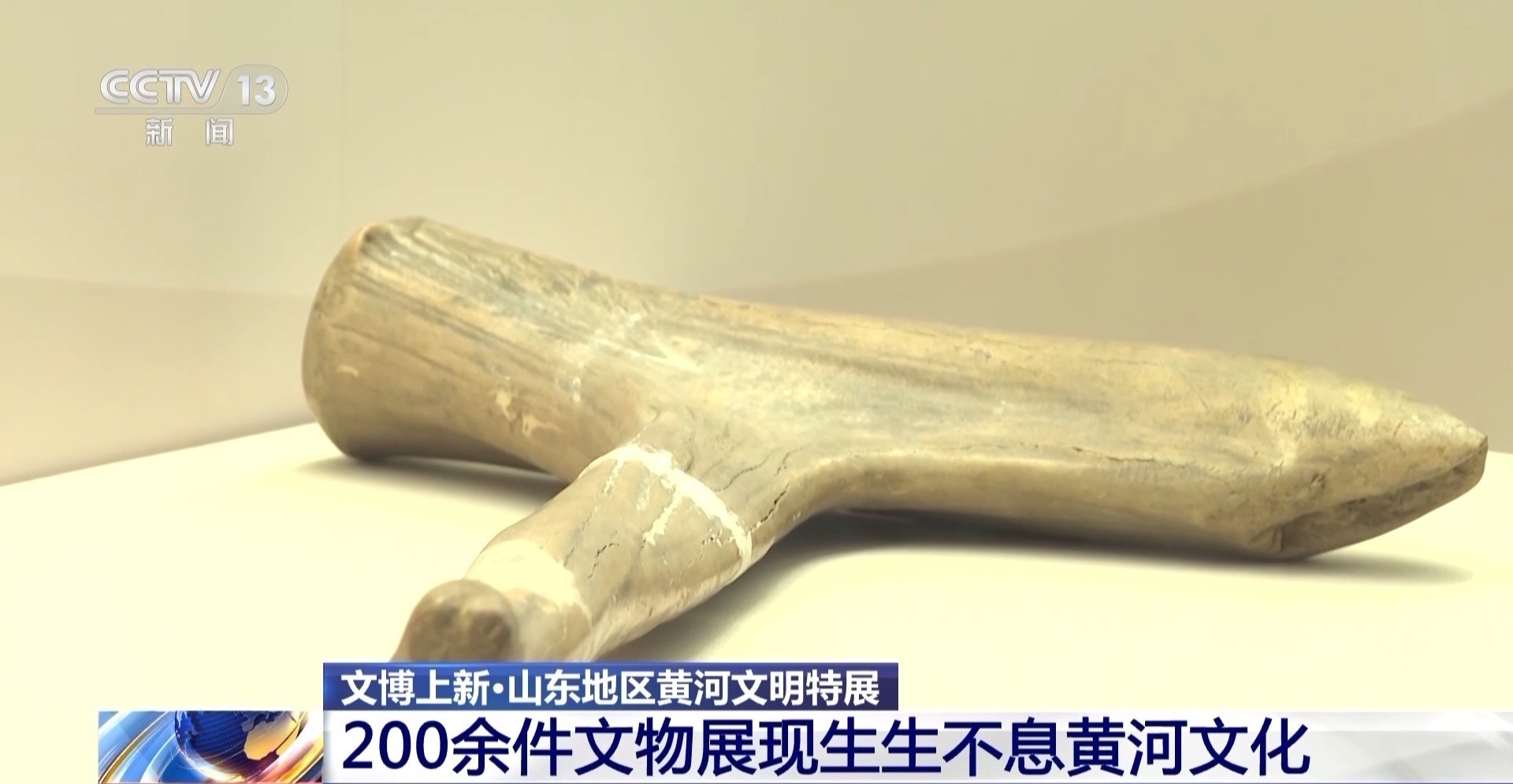 濟南市博物館陳列展覽部策展人 于筱箏:它是新石器時代大汶口文化時期的一件鹿角鋤,它的一面比較圓鈍,可以用來敲擊比較堅硬的物品,比如土塊、石頭等等。另一面比較尖銳,就可以用來刨、镢、刨坑松土。