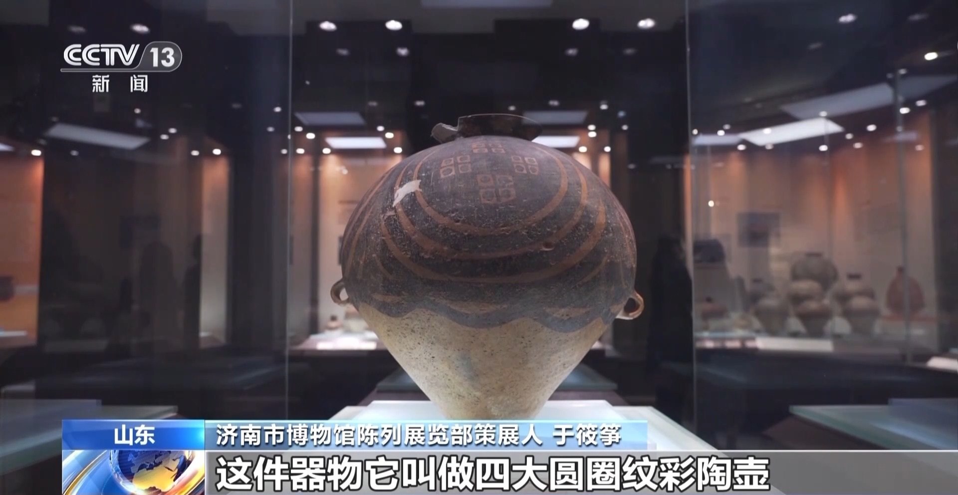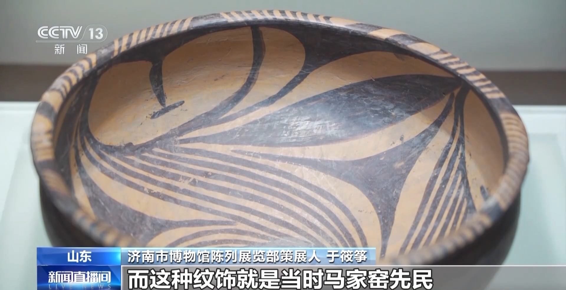 濟南市博物館陳列展覽部策展人 于筱箏:例如我們此次展覽中展出的兩件非常重要的漩渦紋彩陶壺和漩渦紋彩陶盆,其上均是以漩渦紋為主要紋飾,而這種紋飾就是當時馬家窯先民對于黃河奔騰河水的一種非常概括,以及極富想象力的描繪,它們也是新石器時代晚期黃河文明形成與發(fā)展的一種重要見證。