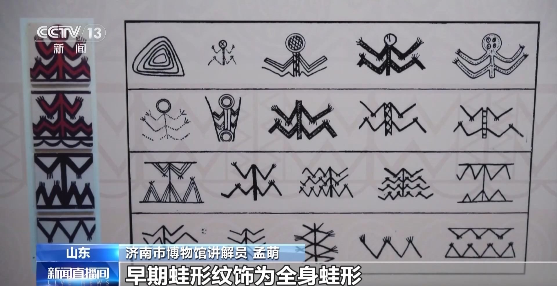 濟南市博物館講解員 孟萌:早期蛙形紋飾為全身蛙形,在這一時期蛙頭部往往是圓圈形,里面繪有不同的圖案,而它的四肢往往是波狀紋,并且它的足是有不同的趾,到了中期則變得更為簡化和自然,而到了晚期變成了一種結(jié)構(gòu)化的圖案。體現(xiàn)了他們希望自己的部落能夠繁衍生息、發(fā)展壯大的美好愿景。