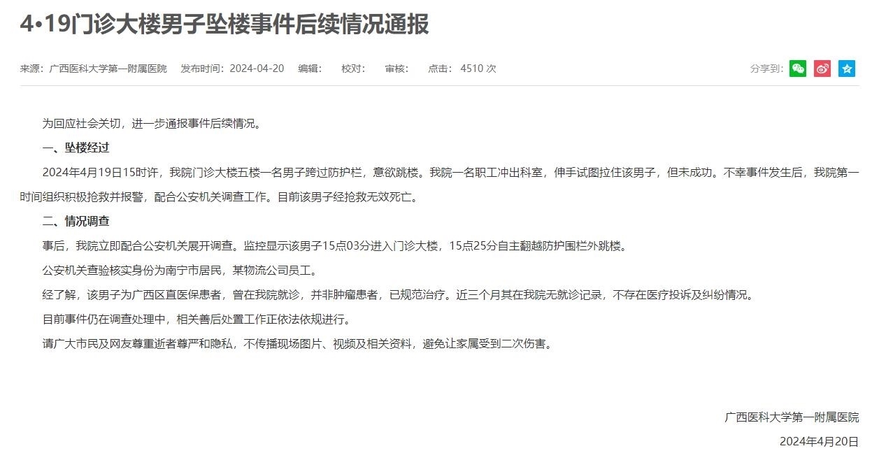 央視網(wǎng)消息:據(jù)廣西醫(yī)科大學(xué)第一附屬醫(yī)院網(wǎng)站消息,4月20日,廣西醫(yī)科大學(xué)第一附屬醫(yī)院發(fā)布《4·19門診大樓男子墜樓事件后續(xù)情況通報》。全文如下: