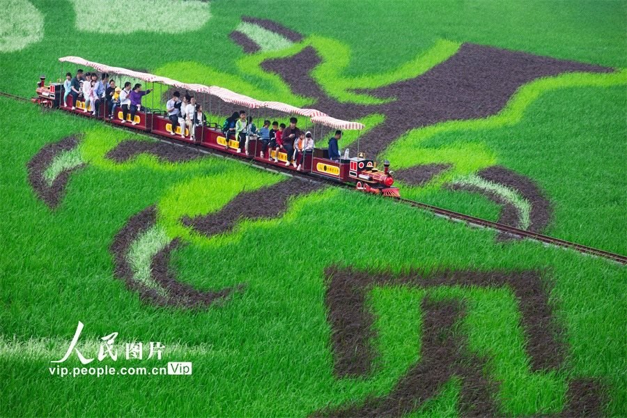 2024年5月2日,廣西南寧市賓陽(yáng)縣古辣鎮(zhèn)大陸村綠油油的田野上,“見(jiàn)龍?jiān)谔?國(guó)安家圓”大型中國(guó)龍主題稻田藝術(shù)畫(huà)吸引了許多游客前來(lái)參觀游覽。曾祥忠攝(人民圖片網(wǎng))