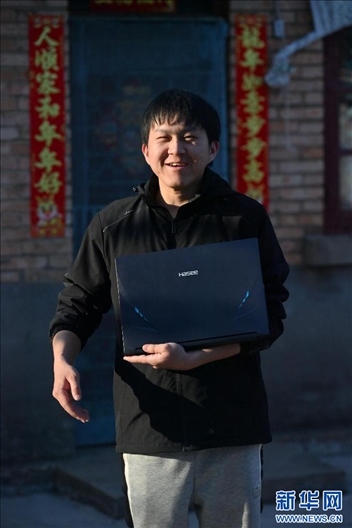在柳州市鷓鴣江路附近一處出租屋外,熊三耶在展示剛剛購(gòu)買的筆記本電腦(2024年2月11日攝)。新華社記者 黃孝邦 攝
