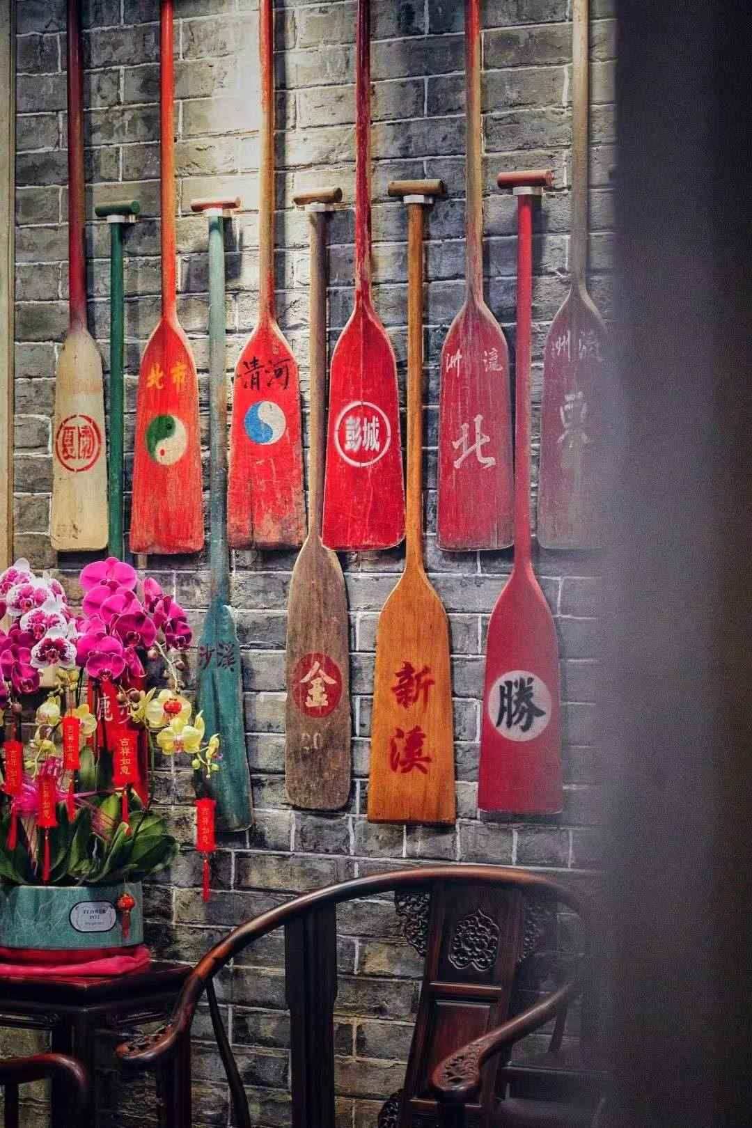 在張偉潮工作室的青磚墻上掛滿了劃龍舟所用的船槳?!皝?lái)取龍頭的人大多會(huì)送一面錦旗,我說(shuō)不要錦旗,可以把你們不用的槳送給我?!边@些年張偉潮陸續(xù)收到了300多支船槳,在他看來(lái),每一把槳都蘊(yùn)含著自己隊(duì)伍、村落的故事,每一把都是獨(dú)一無(wú)二的,他要把船槳當(dāng)作錦旗一樣高高地掛在墻上。