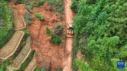 6月18日,工作人員駕駛機(jī)械在貴州省黔東南苗族侗族自治州錦屏縣鐘靈鄉(xiāng)清理進(jìn)村道路(無人機(jī)照片)。
