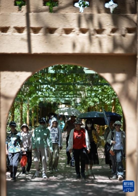 6月29日,游客在吐魯番葡萄溝景區(qū)游覽。