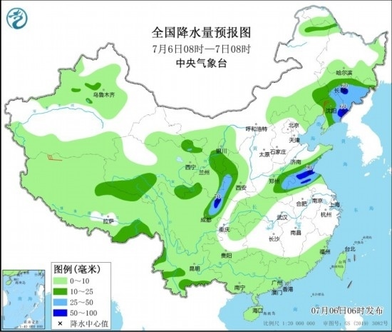 7月6日08時至7日08時,內(nèi)蒙古東南部、東北地區(qū)中東部和西部、西藏北部和東南部、青海南部、西北地區(qū)東北部、黃淮東部和西部、江淮東部和西部、四川盆地西北部、云南西南部等地部分地區(qū)有中到大雨,其中,吉林中東部、遼寧東部、山東南部、江蘇北部、四川盆地西北部等地部分地區(qū)有暴雨(50~90毫米)。遼寧中部、西藏西部等地部分地區(qū)有4~6級風(fēng)。