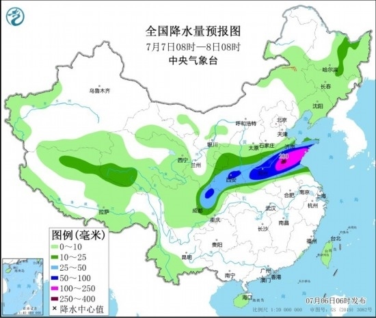 7月7日08時至8日08時,陜西中南部、黃淮大部等地部分地區(qū)有大到暴雨,其中,山東中東部和南部等地部分地區(qū)有大暴雨,山東南部等地局地特大暴雨(250~280毫米)。內(nèi)蒙古中部部分地區(qū)有4~5級風(fēng)。