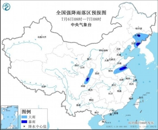 預(yù)計,7月6日08時至7日08時,吉林中東部、遼寧東部、陜西南部、山東南部、河南東部、安徽北部、江蘇北部、四川盆地西北部等地部分地區(qū)有大雨,其中,吉林中東部、遼寧東部、山東南部、江蘇北部、四川盆地西北部等地部分地區(qū)有暴雨(50~90毫米)。上述部分地區(qū)伴有短時強降水(最大小時降雨量20~50毫米,局地可超過60毫米);吉林東部、遼寧東部、山東南部、河南東部、安徽北部、江蘇北部等地的部分地區(qū)將有8-10級雷暴大風(fēng)或冰雹天氣。中央氣象臺7月6日06時發(fā)布暴雨藍(lán)色預(yù)警和強對流天氣藍(lán)色預(yù)警。