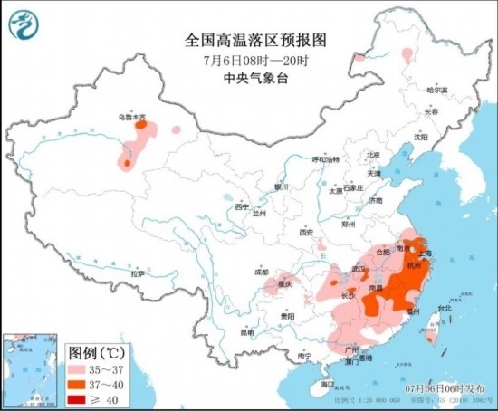 全國高溫落區(qū)預(yù)報圖(7月6日08時-20時) 圖源:中央氣象臺網(wǎng)站