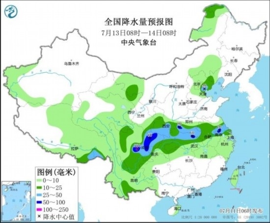 全國(guó)降水量預(yù)報(bào)圖(7月13日08時(shí)-14日08時(shí))