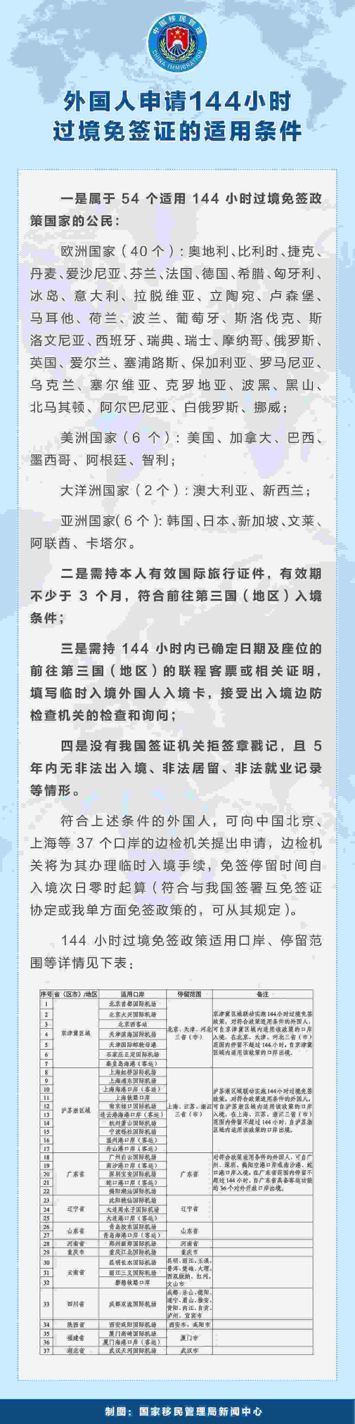 據(jù)了解,截至目前,國家移民管理局已在北京,天津,河北石家莊、秦皇島,遼寧沈陽、大連,上海,江蘇南京、連云港,浙江杭州、寧波、溫州、舟山,河南鄭州,廣東廣州、深圳、揭陽,山東青島,重慶,四川成都,陜西西安,福建廈門,湖北武漢,云南昆明、麗江、西雙版納等地的37個口岸實施144小時過境免簽政策。美國、加拿大、英國等54國公民持有效國際旅行證件和144小時內(nèi)確定日期及座位的聯(lián)程客票從上述口岸過境前往第三國(地區(qū)),可免辦簽證在規(guī)定區(qū)域內(nèi)停留不超過144小時,停留期間可從事旅游、商務、訪問、探親等短期活動(符合與我國簽署互免簽證協(xié)定或我單方面免簽政策的,可從其規(guī)定)。