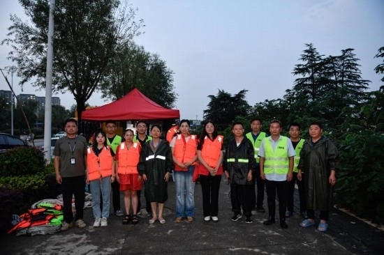 7月18日,呂懷義(右一)在唐河岸邊與值守的部分工作人員合影。新華社記者 吳剛 攝