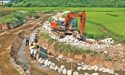 7月26日,湖南省洪江市巖垅鄉(xiāng)竹坪垅村,施工人員加緊修復(fù)被洪水沖毀的溪邊農(nóng)田??病铄a建攝(人民視覺)